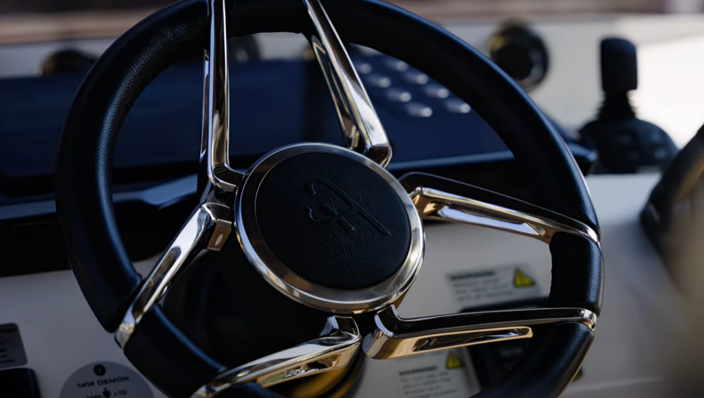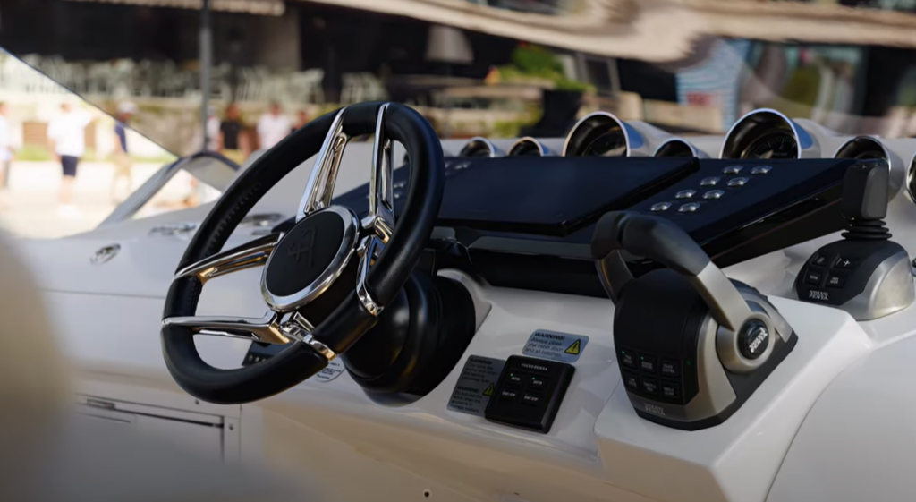 Das Cockpit der Frauscher 1414 Demon überzeugt mit hochwertigen Materialien und einer aufgeräumten intuitiven Armatur. Neben dem digitalen Bildschirm gibt es eine Reihe von stilvollen Rundinstrumenten, ein sportliches Lenkrad und einen Joystick, auf Wunsch sogar mit Anlegefunktion.