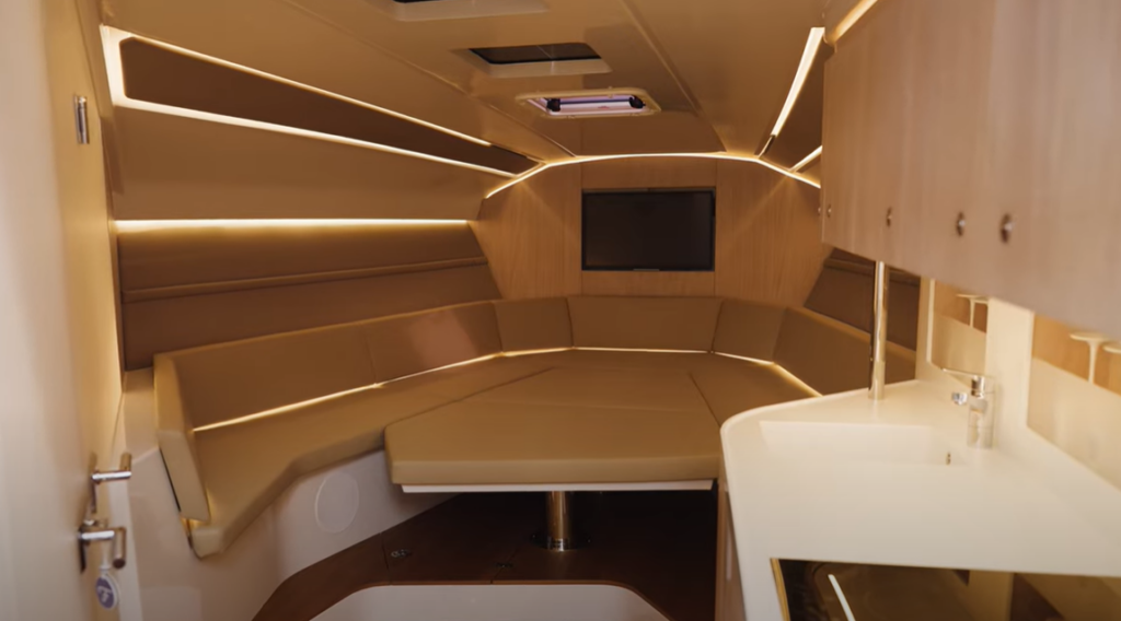 Dahinter folgt ein großer Sitz- und Essbereich im Bug. Mit wenigen Handgriffen kann dieser Essbereich zu einer Schlafmöglichkeit für zwei Personen umfunktioniert werden. Die zweite Schlafmöglichkeit befindet sich achtern, direkt hinter dem luxuriös ausgestatteten Badezimmer. Der gesamte Innenraum wirkt durch die warme LED-Beleuchtung modern und gleichzeitig gemütlich.