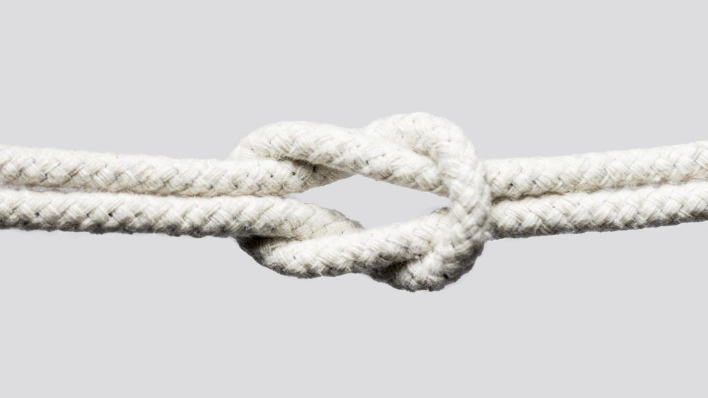 Der Kreuzknoten lässt sich sehr einfach knüpfen, um zwei Seile gleicher Stärke miteinander zu verbinden. Wichtig ist, dass die Seile nicht aus zu glattem oder zu steifem Material bestehen, sonst hält der Knoten nicht.