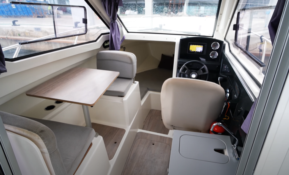 Mit im Cockpit ist eine Sitzgelegenheit für 5 Personen mit einem einklappbaren Cockpittisch in der Mitte. Wird anstelle des Tischs ein Polster eingehängt, erhält man eine wettergeschützte Sonnenliege oder einen weiteren Schlafplatz.
