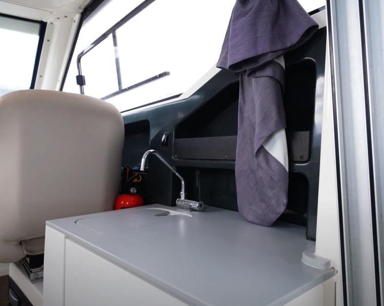 Eine kleine Küchenzeile steht ebenfalls im Cockpit: Optional kann sie mit Waschbecken, Kühlschrank und Kochplatte ausgestattet werden. Es ist nicht viel Platz, aber für kühle Getränke und Snacks reicht es definitiv.