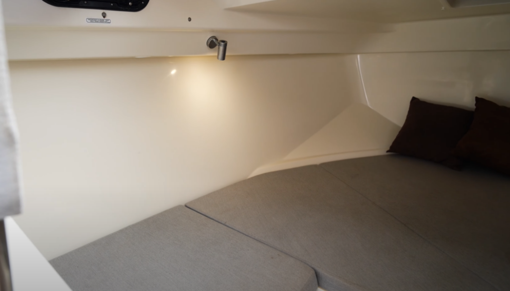Der eigentliche Schlafplatz für zwei Personen befindet sich im Bug, mit jeder Menge Stauraum unterhalb der Schlafpolster. Außerdem gibt es eine überraschend geräumige Toiletten-Kabine mit Seetoilette und Waschbecken.