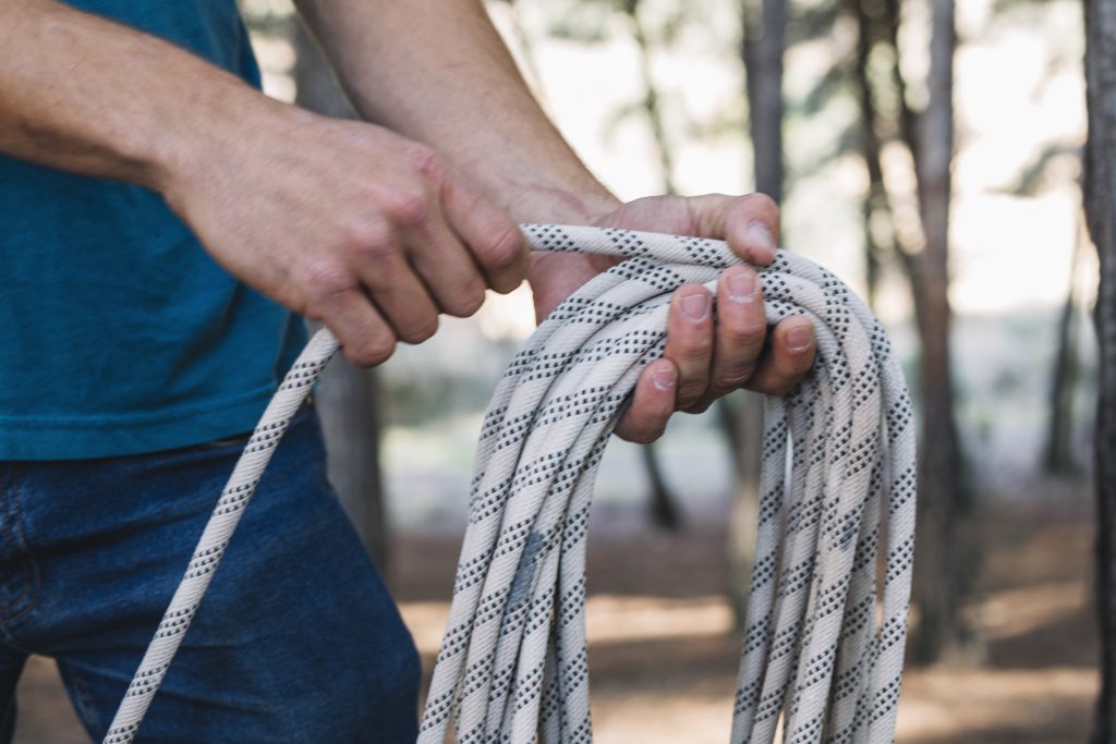 Am ersten Schritt bildest du mit Ende des dickeren Seils ein Auge. Am besten hältst du das Auge zwischen Daumen und Mittelfinger zusammen, während du deinen Zeigefinger ausstreckst.