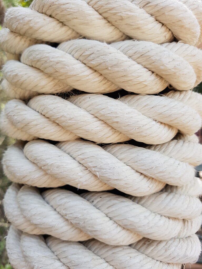 Lege die dünne Leine einmal von vorne nach hinten über das dicke Seil.